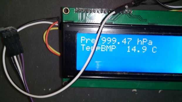 double bmp180CorrectPressure(unsigned long up) { b6 = b5 - 4000; // Calculate B3 x1 = (b2 * (b6 * b6)>>12)>>11; x2 = (ac2 * b6)>>11; x3 = x1 + x2; b3 = (((((long)ac1)*4 + x3)<<OSS) + 2)>>2; // Calculate B4 x1 = (ac3 * b6)>>13; x2 = (b1 * ((b6 * b6)>>12))>>16; x3 = ((x1 + x2) + 2)>>2; b4 = (ac4 * (unsigned long)(x3 + 32768))>>15; b7 = ((unsigned long)(up - b3) * (50000>>OSS)); if (b7 < 0x80000000) p = (b7<<1)/b4; else p = (b7/b4)<<1; x1 = (p>>8) * (p>>8); x1 = (x1 * 3038)>>16; x2 = (-7357 * p)>>16; p += (x1 + x2 + 3791)>>4; return p; } Con el programa anterior uno puede decidir por sí mismo qué hacer con los datos encontrados: enviar a una pantalla, o tal vez lo envíe a través de un enlace de RF a una estación base. Como dijo, la salida de la lectura de la presión es Pascal (Pa). hectopascales son una unidad más conveniente. Algunas otras unidades puede calcularse en: 1 hPa = 100 Pa = 1 mbar = 0,001 bar 1 hPa = 0.75006168 Torr 1 hPa = 0.01450377 psi (libras por pulgada cuadrada) 1 hPa = 0.02953337 inHg (pulgadas de mercurio) 1 hpa = 0.00098692 atm (atmósfera estándar)