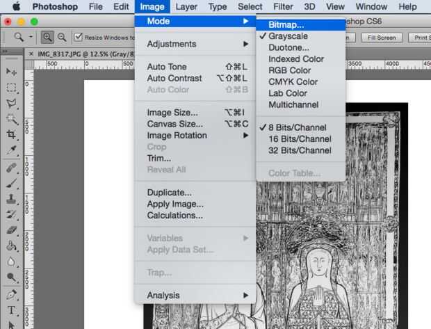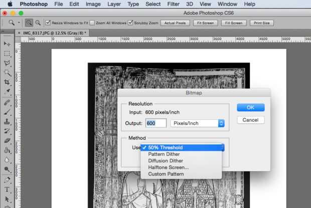 Además, normalmente utilizamos color de 24 bits, ya puede representar millones de colores. Las imágenes JPEG son 24 bits, pero también utilizan una forma de compresión para ayudar a mantener los tamaños de archivo pequeños. En este caso, convertirá la imagen en un mapa de bits de 1 Bit. Es perfecto ya que un bit es sólo ON o OFF. Sólo puede ser usada para representar dos colores - blanco y negro. También crea un archivo que ocupa menos espacio de datos, estando todavía muy alta resolución. Asegúrese de que utilizar 50% umbral y mantienen la alta resolución. Todos los colores luz se convierten en blanco puro, y todos los colores oscuros se convierten en negro puro. No utilice "estremecerse" o "medios tonos", que se introduzcan formas inesperadas en la imagen. (Es un gran efecto para crear imágenes de estilo "corte de madera" aunque!)