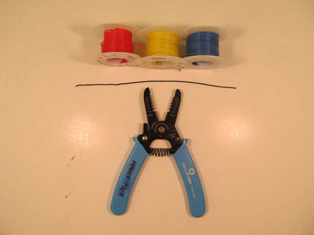 También necesitarás al menos dos tipos de cable de color y un buen conjunto de peladores de alambre. Prefiero cable de núcleo sólido. Normalmente la norma aceptada es utilizar negro para cable de puesta a tierra y el rojo para cable conectado a la energía, pero estoy corriendo bajo en hilo negro, por lo que va a utilizar blanco para tierra en su lugar. También ayuda a tener al menos dos otros colores de hilo para este proyecto, que representan las conexiones del sensor izquierdo y derecho, pero que no es totalmente necesario.