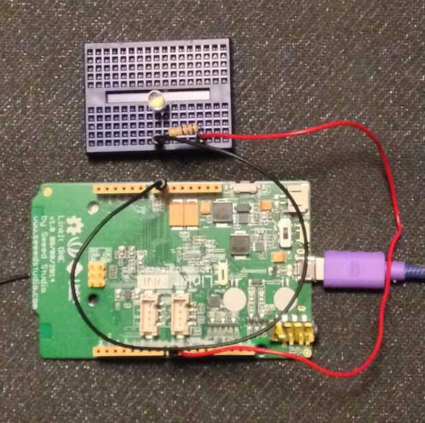 Cabe señalar que los pines de salida digital en Linkit uno son 3.3v con baja capacidad de conducción actual. Estoy usando un LED blanco con tensión directa 3-3.2, en la 20ma.