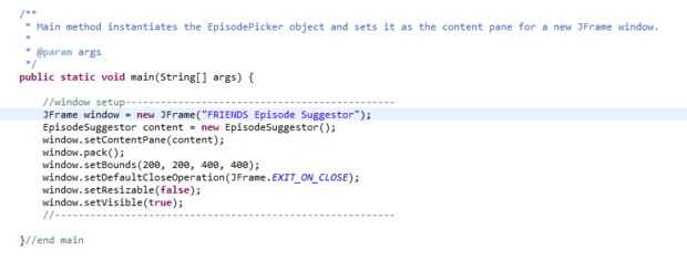 Esta es la sección donde defino el método principal de EpisodeSuggestor, que crea un nuevo JFrame para ser la ventana y un nuevo objeto EpisodeSuggestor que el panel de contenido de la ventana. Configuración de un nuevo EpisodeSuggestor como panel de contenido de la ventana aquí allana el camino para el constructor de la clase EpisodeSuggestor configurar el aspecto real de la pantalla y los elementos interactivos. En cuanto a cosas específicas de la ventana: