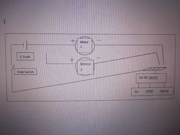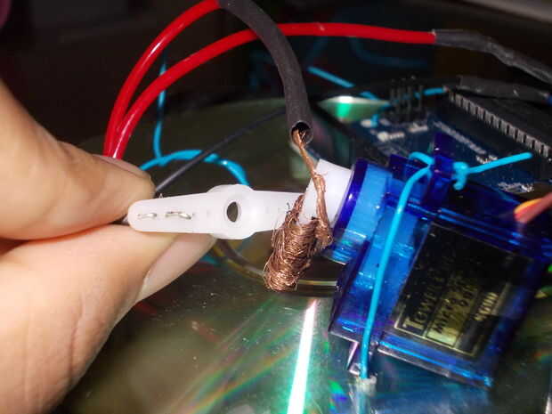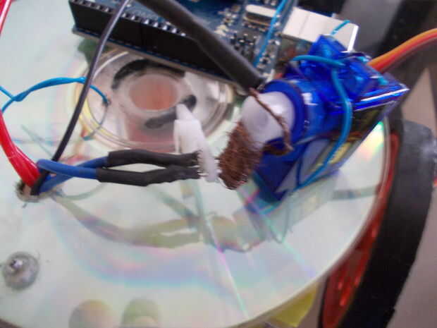 El paralelogramo en la cima del servo quede el cuerno en el que se ata el cable – ve desde el paquete de 3 voltios. Ahora bien, si el cuerno del servo y el alambre hace contacto con dos cables, el circuito se completa para ambos motores y el robot se moverá hacia delante. Pero si la bocina toca sólo un cable funcionará el motor correspondiente.