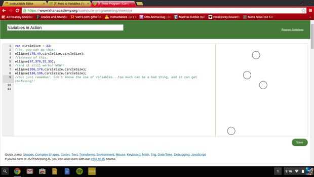 Bien, por lo tanto, las variables son muy fáciles de aprender y fácil de dominar. Por lo tanto, dicen que están haciendo una foto, como he mencionado anteriormente en el ejemplo, con el mismo tamaño círculos por todas partes en la página. No quiero escribir 33 una y otra vez para la anchura y la altura de mis círculos, por lo que crear una variable.