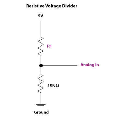 Un divisor resistivo de voltaje le permite hacer una correspondencia entre una resistencia y el valor que viene en un puerto de entrada analógico en un Arduino. Si usted hace mucho más grande que 10K Ohms R1 entonces obtendrás un valor muy bajo en la parte analógica. Si usted hace mucho más pequeños que 10K Ohms R1 obtendrá un alto valor en el puerto analógico.