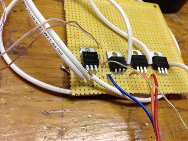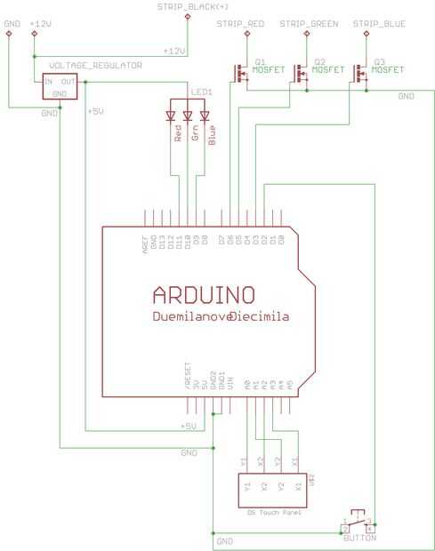 Revisa el esquema de cableado para datos exactos. Te recomiendo que uses el perfboard para los circuitos MOSFET y el voltaje del regulador. Dejar cables a la pantalla táctil, botón y LED solo, por lo que se pueden montar en el salpicadero.