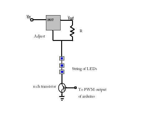 El primer paso es controlar su brillo. Yo he conectado el diseño que hice para un circuito de regulador buck PWM controlado sin embargo más tarde comprendí que uno sólo podría agregar un transistor en serie con las luces y utilizar la señal PWM o un análogo señal de micro controlador para controlar el brillo de las luces. Este es mi siguiente paso, puede ser fácilmente integrado en el proyecto terminado.