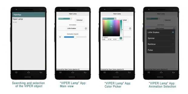 Entonces sólo abierta la víbora de la aplicación, que irá en busca de "viperized" objetos conectados a la red, seleccione el objeto de interés, en este caso la "lámpara de víbora" y usted puede interactuar con ella! En este caso la víbora de la aplicación muestra un selector de color y un menú para la selección de varias animaciones preconfiguradas.