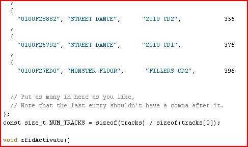 Puede entrar en el bosquejo más adelante y escriba el número RFID de la tarjeta que desea asociarse con un álbum en su lista de reproducción y puede introducir el número de pista en la lista de reproducción de la primera canción en ese álbum, como en la imagen.