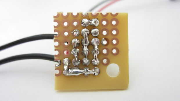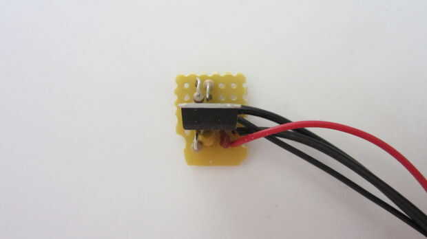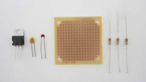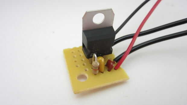 Utilicé un regulador de voltaje variable LM317. Este chip utiliza dos resistencias para ajustar la tensión de salida según la fórmula: Vout = 1,25 x (1 + (R2 / R1)). Utilizando un 1.5kohms y un 240 ohmios trajo la salida hasta unos 9 voltios. Luego utilicé un conector de batería de 9 voltios para conectar al receptor.