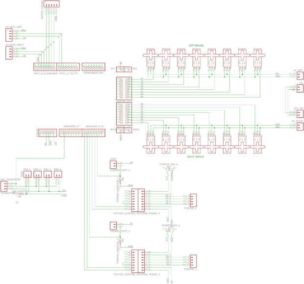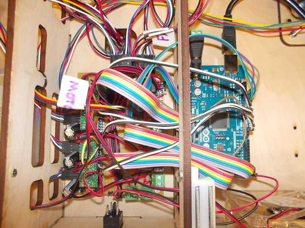 Cuando termine de soldar todos los componentes electrónicos en el tablero de control, conecte las clavijas de encabezado en el perfboard a los diferentes sensores y actuadores en el robot. Además, conectarse todos los pines de control necesario de la perfboard Arduino Mega como se muestra en el esquema. Una imagen es proporcionada para la referencia en el cableado como se verá cuando terminó.