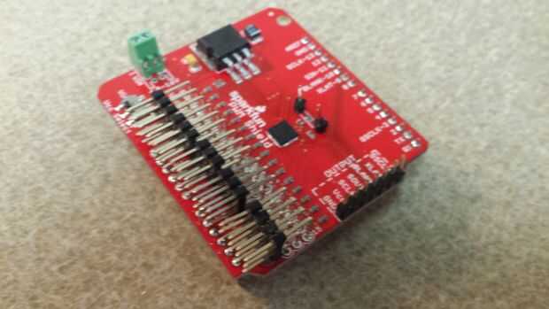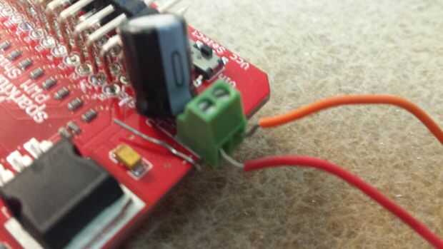 Para empezar, montar el escudo como se muestra en la segunda foto. Los encabezados de ángulo deben estar lejos del regulador de voltaje, mientras que los otros primeros alfileres son no esenciales - el solitarios 2 pines son para cambiar la máxima corriente de salida con una resistencia, y las otras 7 son para conectar otro chip PWM sin necesidad de más pines de Arduino. Para el VIN externo está probablemente bien simplemente soldar en el tablero de arranque USB para la Junta, pero como estuve probando métodos de suministro diferentes he añadido un borne de tornillo en su lugar. Incluye un condensador para reducir cualquier picos de corriente para el Arduino por encender la fuente de alimentación. Y por supuesto, la soldadura en todos los pernos en la parte inferior para conectar al Arduino.