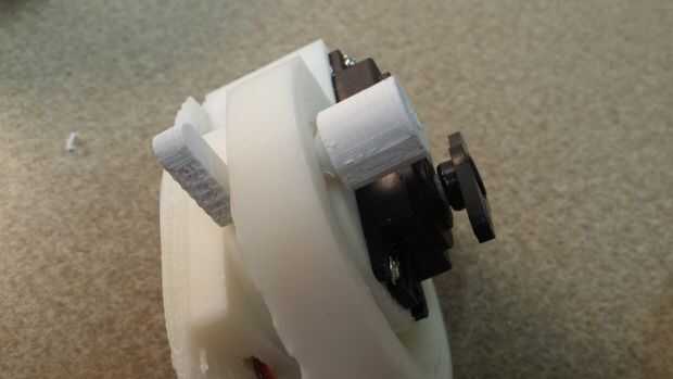 Empezar por instalar el servo en la parte del titular, asegurándose de que el cable a través del pequeño orificio en la parte inferior del hilo de rosca, entonces utilice algunos de los tornillos para fijarlos juntos. Tenga cuidado con los tornillos en el lado cerca del arco: es un poco difícil decir por las fotos, pero la foto 3 muestra un poco cómo la barra FTOEC puede conseguir pegada en el tornillo que sostiene el servo en su lugar, evitando el servo de giro, que dibuja más actuales y puede causar el Arduino reiniciar.