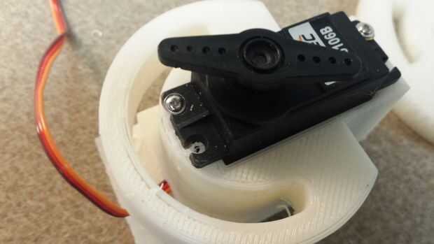 Inserte la varilla FTOEC por el arco, pasar con el borde a lo largo del arco y luego gírelo nuevamente hacia afuera una vez que está en el otro lado. La varilla debe ser capaz de viajar a través del arco a medida que gira el servo, posición que el servo del brazo tal que en un extremo de su rango de movimiento de la varilla en el mismo extremo del arco. Luego, coloque el brazo del servo, tal que el codo se conecta con la barra FTOEC en la parte inferior (enfrente del lado indicado con una flecha en las fotos) y atornille la placa de servo a través del brazo del servo.