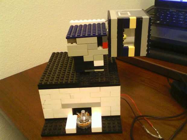 Quería crear un dispositivo que sería dulce, (pero puede dispensar mucho más ya que está hecho de LEGO el contenedor es personalizable a tu gusto) así que me puse a pensar y con muchos intentos de diseño fallidos, decidí ir con un diseño basado en LEGO. Era mucho más flexible para trabajar con. ¿Cómo funciona? Bueno, eso es fácil, que el dispositivo está programado con el Arduino Uno, que tiene un mando unido a él, el mando está programado por código. Una vez el botón activará un motor cinemático, que girará el contenedor en un ángulo de grados cuarenta y cinco negativos, dispensar el caramelo por el orificio de la boca abierta en el envase. Entonces simplemente girando la perilla nuevamente dentro de la posición original reiniciará el recipiente a la posición comenzó en.