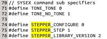 // SYSEX command sub specifiers #define TONE_TONE 0 #define TONE_NO_TONE 1 #define STEPPER_CONFIGURE 0 #define STEPPER_STEP 1 #define STEPPER_LIBRARY_VERSION 2