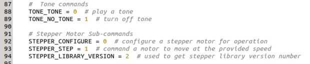 # Tone commands TONE_TONE = 0 # play a tone TONE_NO_TONE = 1 # turn off tone # Stepper Motor Sub-commands STEPPER_CONFIGURE = 0 # configure a stepper motor for operation STEPPER_STEP = 1 # command a motor to move at the provided speed STEPPER_LIBRARY_VERSION = 2 # used to get stepper library version number