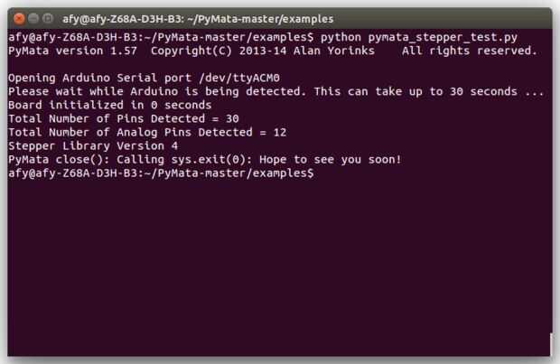 A continuación queremos ejecutar un script de prueba incluido con la distribución de PyMata . En el directorio de ejemplos de PyMata , es un python script llamado pymata_stepper_test.py (el código se muestra a continuación). Para ejecutar esta secuencia de comandos, vaya al directorio de ejemplos y tipo:
