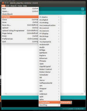 En primer lugar, utilizando el IDE de Arduino, compilar y cargar el bosquejo FirmataPlus.ino modificado seleccionando archivo/ejemplos/FirmataPlus que sólo modificamos.