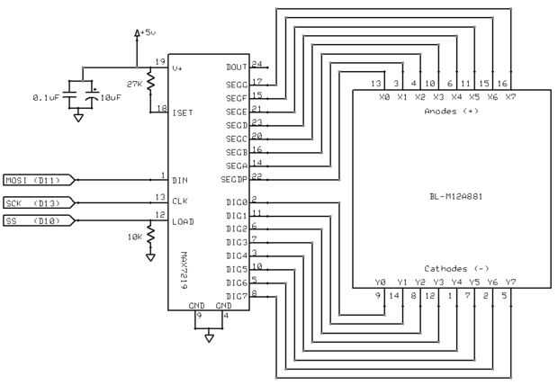 Ver en la imagen adjunta el diagrama de interconexión entre Arduino y módulo MAX7219 (en este caso es usado sólo 2 módulos de MAX7219):