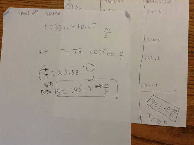 Basado en esta fórmula, la velocidad aceptada del sonido a 75 F (23,88 grados centígrados), S = 345.9 m/s