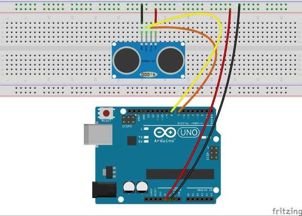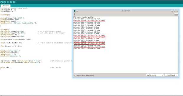 En la primera línea de las instrucciones de Arduino recibe el tiempo de reflexión de ondas ultrasónicas de la HR-SR04. Este tiempo es necesario para calcular la distancia mediante la fórmula distancia = (tiempo de nivel alto × velocidad de la sonido) / 2 se muestra en la segunda línea.