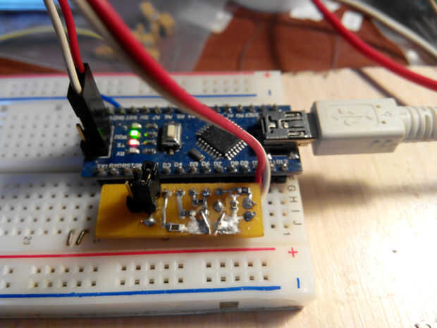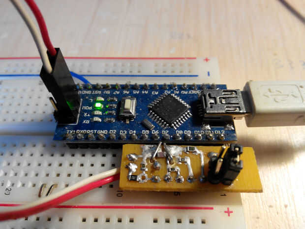 La Junta resultante puede conectada a Arduino Uno directamente o conectada a un Nano en un protoboard. Si su PCB es 10mm de ancho, se lo puede introducir en un protoboard dos maneras de utilizar cualquiera de los dos pines 3-4 o 9-10 para el Rc (ver fotos arriba).