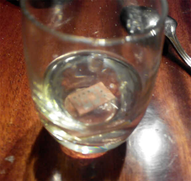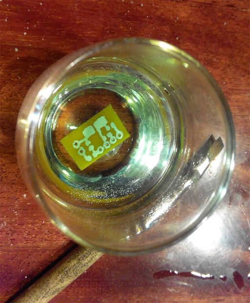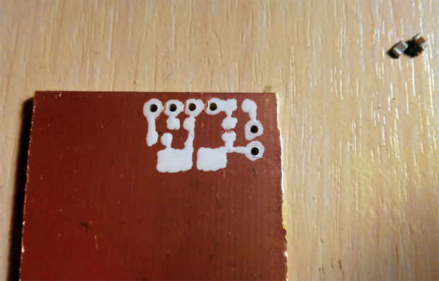 Corte la madera al tamaño necesario, limpia fondo (papel de lija y líquido para lavar platos), marque y taladre los orificios. Dibujar el circuito con el marcador. Verter algunos peróxido de hidrógeno en un vaso de tamaño apropiado o envase de plástico (yo usé un vaso de chupito), Añadir ácido cítrico (para esto el tamaño de media cucharadita) y una pizca de sal. Revuelva. Poner la placa en la solución resultante y esperar una media hora, retirar periódicamente las burbujas emergentes con un pincel o una pluma. Una vez que desaparece el cobre dispuesto conseguir el tablero hacia fuera, retire la pintura con aguarrás y séquela. Compruebe todas las conexiones con un multímetro, si algunos rastros son en corto que no debería ser – encontrar el problema y quitar con bisturí. Aplique capa lata, colocar y soldar todo. Tenga en cuenta que para un más grande del tablero te tendrás que conectar dos orificios con un alambre en la parte posterior (azul en el esquema).