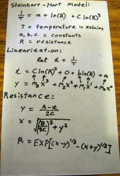 - Modelo de Steinhart-Hart: Esto demuestra cómo funciona la linealización del modelo de Steinhart-Hart. No derivan de la conversión a la resistencia, esto se encontró con Wikipedia.