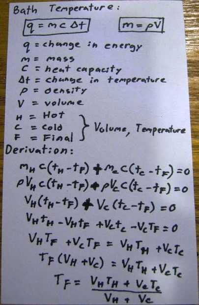 - Temperatura del baño: Se trata de la derivación de la temperatura del baño dado la mezcla de agua fría y caliente en volúmenes específicos.