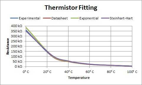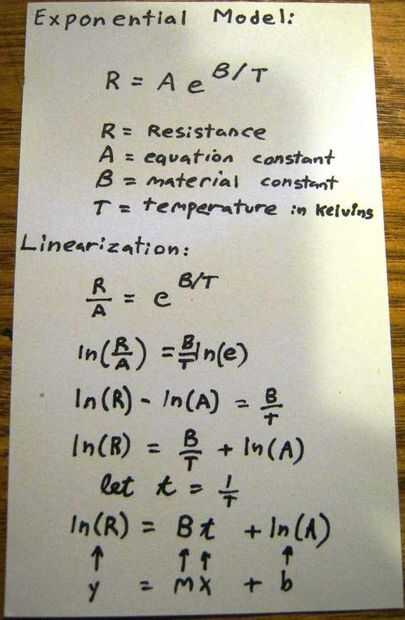 - Tabla: Algunos fabricantes ofrecen sólo una tabla de resistencia vs temperatura. Una manera fácil de encontrar los puntos no es justo asumir que la distancia entre un punto y su vecino más cercano es una línea. Dado dos puntos, la pendiente y el intercepto para esta pequeña región se pueden encontrar.