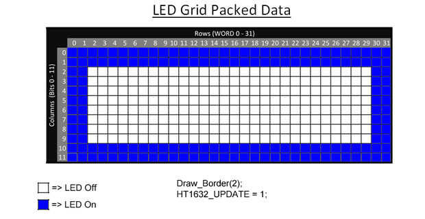 Esta función dibujará un borde alrededor del perímetro de la rejilla LED. El ancho de la frontera se establece por el valor pasado en 'width'. El valor máximo de una frontera es 6 píxeles (6 píxeles * 2 lados = 12 COLs) y el valor mínimo es 1 (obviamente). El ejemplo siguiente se demuestra en la foto #4.