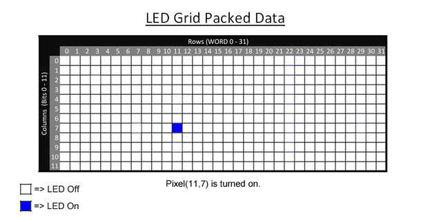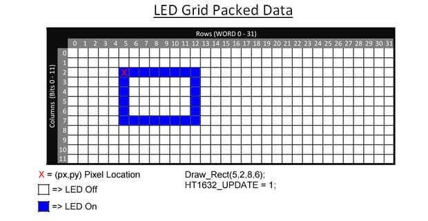 Esta función toma un (x, y) coordinar y modifica el bit que representa el píxel. Si 'estado' es igual a 1, el bit que el pixel representa un 1, si el estado es igual a 0, se borrará el bit a 0. En el paso #45 en el ejemplo #2, tuvimos que modificar los datos del LED a encender Pixel(11,7). Si tuviéramos que utilizar esta función para encender el LED en (11.7) escribiría: