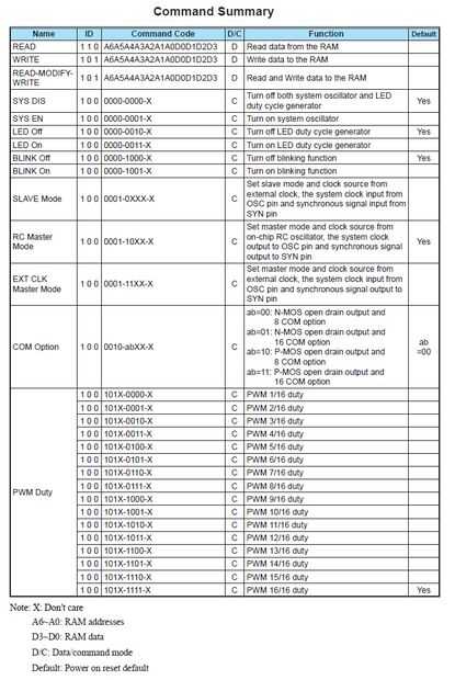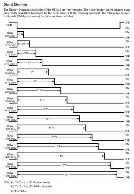 Esta función se encuentra en los archivos de controlador de HT1632C y puede establecer la red LED en 16 niveles diferentes de brillo. Foto #5 muestra el deber los ciclos para cada brillo y Foto #6 muestra los ciclos de trabajo de cada brillo en forma de gráfico. Esta función no necesita una actualización de red después de que se llama como se escribe directamente en los controladores HT1632C y ajusta el brillo a través de PWM. Si queremos configurar la red LED a atenuarse hasta un ciclo de trabajo 10/16 (consulte la tabla de valor) escribiría: