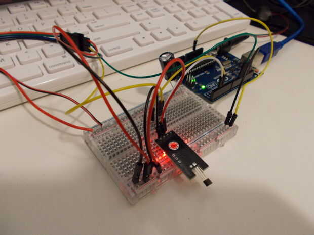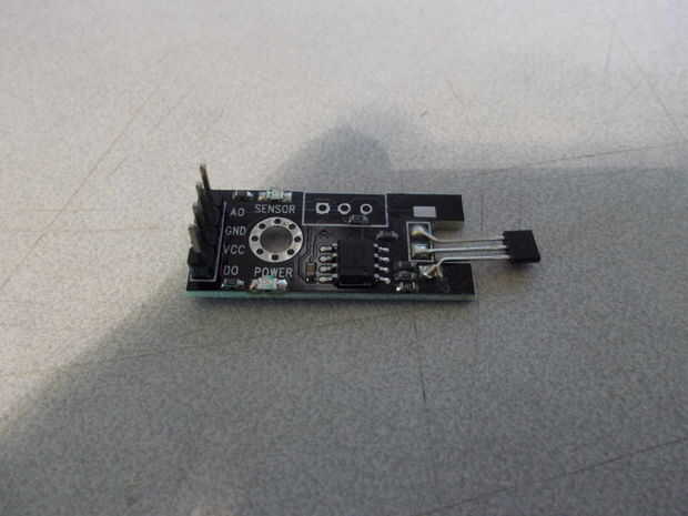 Usé mi computadora para probar el circuito pero se puede utilizar un adaptador de batería o en mi caso tomé prestado un panal de un amigo que está estudiando para ser ingeniero. Cuando conecte una fuente de energía, y he conectado los cables correctamente en el tablero, el Sensor Hall deberá encenderse como se ve en la foto.