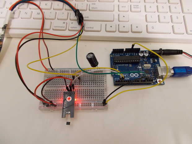 Cuando usted mira el Sensor Hall, recuerde que el pin es que cuando conectas tus jumpers en la placa. De derecha a izquierda, vas a colocar sus pernos de reloj, la alimentación y la tierra. Tiene dos sistemas de alimentación y tierra en la tira de LED, un sistema irá a un lado de la placa y los otros se van al lado opuesto. Su alimentación y tierra de tu Sensor se conectar a la tarjeta que se conecta el sensor al poder y líneas de tierra mientras que su reloj se conecte a tu Arduino. En una conexión de la tierra y el poder, conecte su 100 condensador de 16 voltios de uF, largos de la pierna a pierna corta energía a tierra. Coloque otro juego de cables de alimentación y tierra como se conectan directamente a tu Arduino y la placa de alimentación.