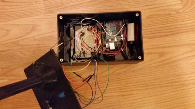 Ahora podemos super pegamento de la base del ventilador en la parte superior de la caja después de asegurarse de que los cables van a la caja como necesaria para llegar a la protoboard y arduino. Después de que es completa, ya casi terminamos! Ahora tenemos que garantizar que los potenciómetros son asegurados en su lugar en la parte superior de la Junta y conectados al arduino y protoboard. Los podemos superglue abajo así como si no hay precreated agujeros en la parte superior de la caja. También, asegúrese de incluir un lugar para que el LED en el frente del ventilador y la caja permitir que los pines de lo LED ir en la caja y conectar con el protoboard y arduino. Una vez que todo está unido, estamos completos! Ahora podemos conectar a batería de 9v en el arduino y verlo correr!