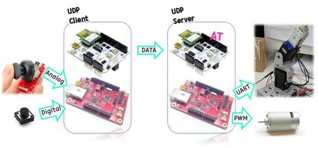 Yo uso un WiFi (a la izquierda en la foto) como cliente de UDP con joystick y el botón.