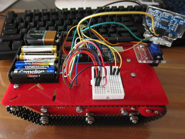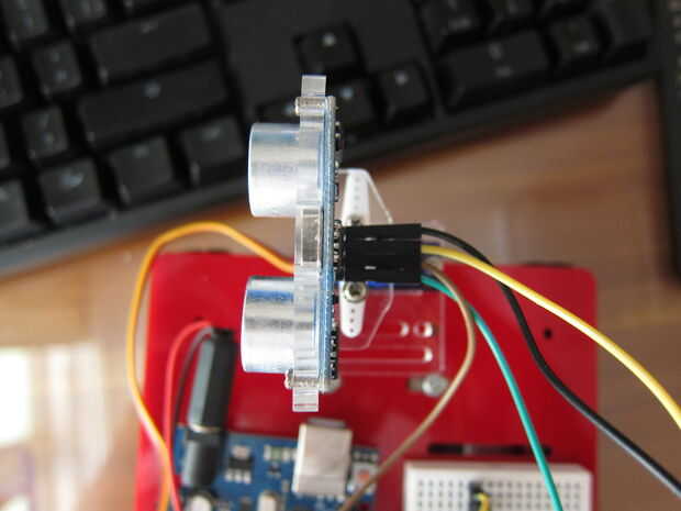El servo incluido con este sensor puede mover 180 grados. Porque quiero el tanque inteligente para evitar cualquier cosa en la parte delantera, sería demasiado sensible evita obstáculos en 180 grados. Quiero que el servo se mueve en cierto grado frente al tanque, no en el grado completo del servo. El servo debe ser calibrar y asegúrese de que 90 grados es apuntando al frente. Puede girar el servo en sentido antihorario hasta que se queda pegado. Luego conecte el sensor y en otra vez señalando a 9. Después eso vuelta el servo 90 grados en sentido horario hasta que apunta al frente.