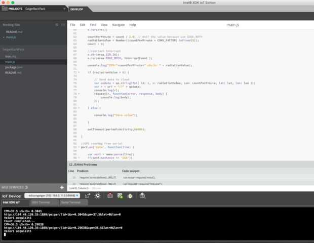 Abra el proyecto GeigerBackPack y presione el botón "upload" en la parte inferior ficha lanzamiento la aplicación. Después de 10 segundos, verá el valor de medición aparece en el visor, puede ver las mediciones directamente en un navegador Si desea conectar a IntelEdison: http://addressip:88 / o todas las mediciones en formato json: http://addressip:88/fecha
