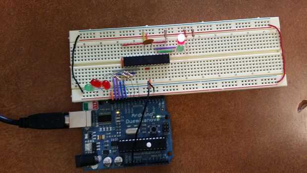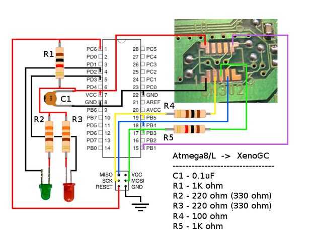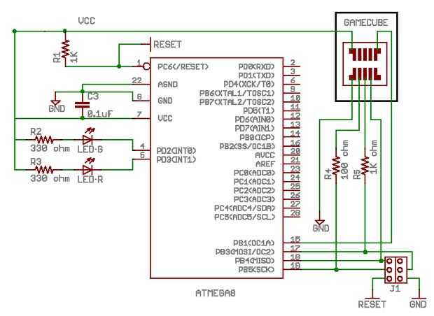 Construya el circuito mostrado en la placa utilizando un cable de 22 AWG para las conexiones. Sin embargo, no conecte los cables y resistencias a la GameCube (que quiere decir que R4 y R5 no se utilizan). Conecte el programador AVR ISP en la cabecera de ISP en el circuito (J1). Si no tienes un programador AVR ISP, usar un Arduino con un cable USB y siga la siguiente tabla de conexión. Código de ejemplo está incluido en el IDE de Arduino que el Arduino para que actúen como un programador AVR ISP serial.
