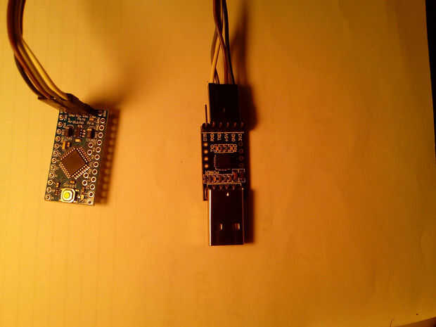 En la foto de arriba se puede ver (de izquierda a derecha) el arduino Pro Mini (sin el cable soldado porque is'nt importante aquí) y el "Pin 6 USB 2.0 módulo UART TTL". Están conectados por un cable de 4 hilos con conectores hembra-hembra. El esquema de conexiones es muy simple:
