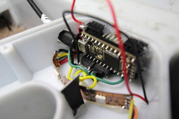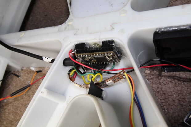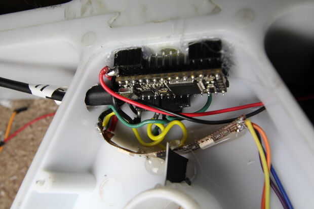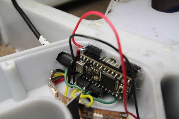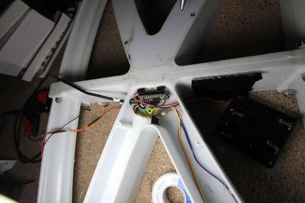 El rojo caliente del alambre de la batería también debe ser soldado al pin que se suelda el cable de 5V desde el segmento del LED y la misma va para el cable de tierra de la batería y el pin que se suelda el cable de tierra desde el segmento LED a. Será necesario un orificio a taladrar en la pared de armazón para los cables deben pasar a través de la primera, como la batería se monta en el exterior de la rueda.