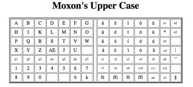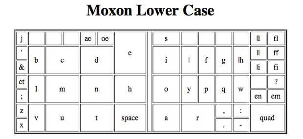 Por último, una ingeniosa pieza de trivia - los orígenes de la noción de "mayúsculas" y "minúsculas" provienen el hecho de que muy temprano tipo casos eran lo suficientemente grandes como para mantener dos conjuntos de caracteres, pero para facilitar las cosas para los tipógrafos, se convirtió en práctica habitual dividir los casos en 2 (haciéndolos más pequeños y ligeros) - tradicionalmente los casos eran apilados , con la "mayúscula" utilizado para almacenar las letras mayúsculas y la "minúscula" utilizada para almacenar las versiones no-caps. Los diseños de superior e inferior casos también diferenció, dado otra vez las variaciones en la frecuencia de carácter.