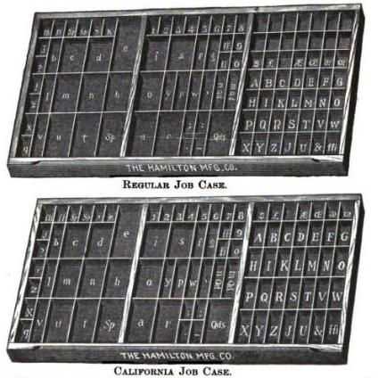 Además, el formato y el diseño de casos de tipografía cambiaron con el tiempo a ser más eficientes para grandes volúmenes composición, especialmente para los periódicos - y así 17 siglo inglés estándar caso difiere un poco de un caso holandés de principios del siglo 19 y aún más de los casos de tipografía estándar "California trabajo" que fueron producidos extensamente durante la expansión occidental de los Estados Unidos en el siglo XIX.
