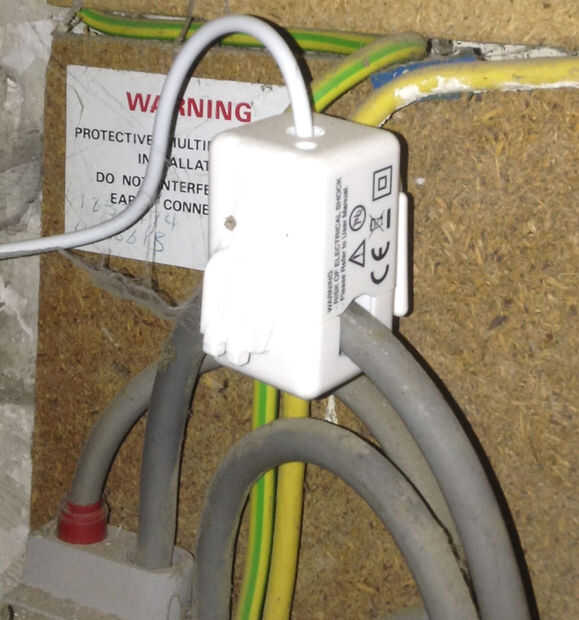 Una vez completada la calibración, se puede instalar el kit completo. La foto muestra que el sensor de corriente conectado a uno de la red de cables de alimentación en mi casa.