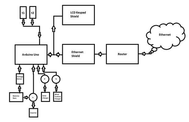 El módulo Lee los valores de las entradas analógicas que están conexión los sensores de corriente (uno de los paneles fotovoltaicos y un aerogenerador), el voltaje del sensor (para baterías de banco) y una digital de entrada para sensores de temperatura (para baterías de banco de medición de temperatura y el ambiente exterior), servidor web transmite (método POST) y llamada a PHP script inserta datos en una base de datos. Los datos transmitidos son valores medios después de las lecturas a intervalos de 10 ms por 2 segundos (200 muestras), dando por resultado la inserción en la base de datos en un intervalo de 2-3 años, 1200 muestras por hora.
