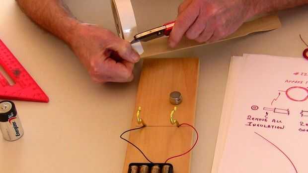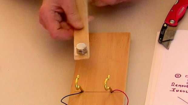 Una vez que la batería está conectada el motor está lista para el primer funcionamiento de prueba. Basta colocar la armadura ejes bobina suavemente en los ganchos de techo y deslice los imanes hacia la bobina (Asegúrese de que los granos de espaciamiento se instalan en los árboles primero). A veces un poco sacudidas del brazo de control es necesaria para conseguir el giro del inducido. Si es necesario da la bobina un poco de ayuda con el dedo para conseguir algo de acción (ver paso 3). De cualquier manera, el motor debe funcionar a diferentes velocidades como los imanes se mueven hacia adelante y hacia atrás debajo de la armadura. La armadura invertir la dirección en algún momento a lo largo de su recorrido. Hay una buena oportunidad la armadura recoger suficiente velocidad y vibra bastante, para hacerlo saltar de los ganchos. Paso 5 muestra cómo se resolvió este problema.