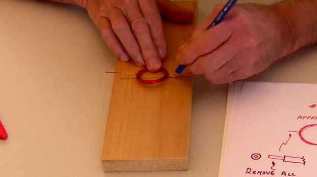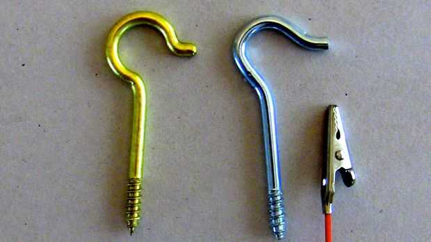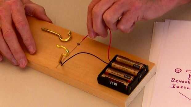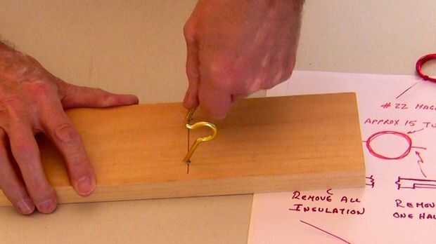 Para permitir que los ganchos de horquilla cómodamente los árboles de alambre de la armadura, se atornillan los ganchos en la base de madera a unos 60 grados con la horizontal. Lo mejor es primero crear orificios para los dos ganchos forzando una punta de punzón o la punta del destornillador phillips pequeño en la madera con un movimiento giratorio. Los orificios piloto hacen bastante simple conseguir los ganchos atornillados en ángulo recto. A continuación retirar los ganchos y asomó los extremos desnudos de los cables de la batería en los agujeros y una vez más atornilla los ganchos para asegurar los cables en su lugar.