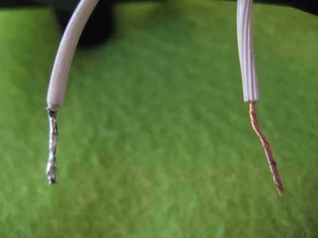 Una vez que todo está conectado y trabajando, usted necesitará decidir sobre una fuente de alimentación de Arduino (a menos que quiera seguir usando un cable USB). He optado por una pared de 9V adaptador de alimentación de un viejo pedazo electrónico que ya ha sido lanzado lejos. Corte final y había estañado de las puntas de alambre. (Estañado es aplicar una capa delgada de soldadura para mantener todos los cables juntos cuando se trabaja, hacen fáciles de empujar en un protoboard).