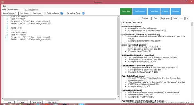 La cúpula y el cuerpo también aletas uso scripts similares con sus posiciones mínimos y máximos ajustados para cada servo donde sea necesario. El primer director de la secuencia de comandos tiene cada escritura individual para cada acción individual, por ejemplo... La aleta abierta, aleta cerca, implementar herramienta, herramienta retraer y así sucesivamente. Esto también se hace para "encender" y "Off" y las lecturas del sensor de arranque y parada.